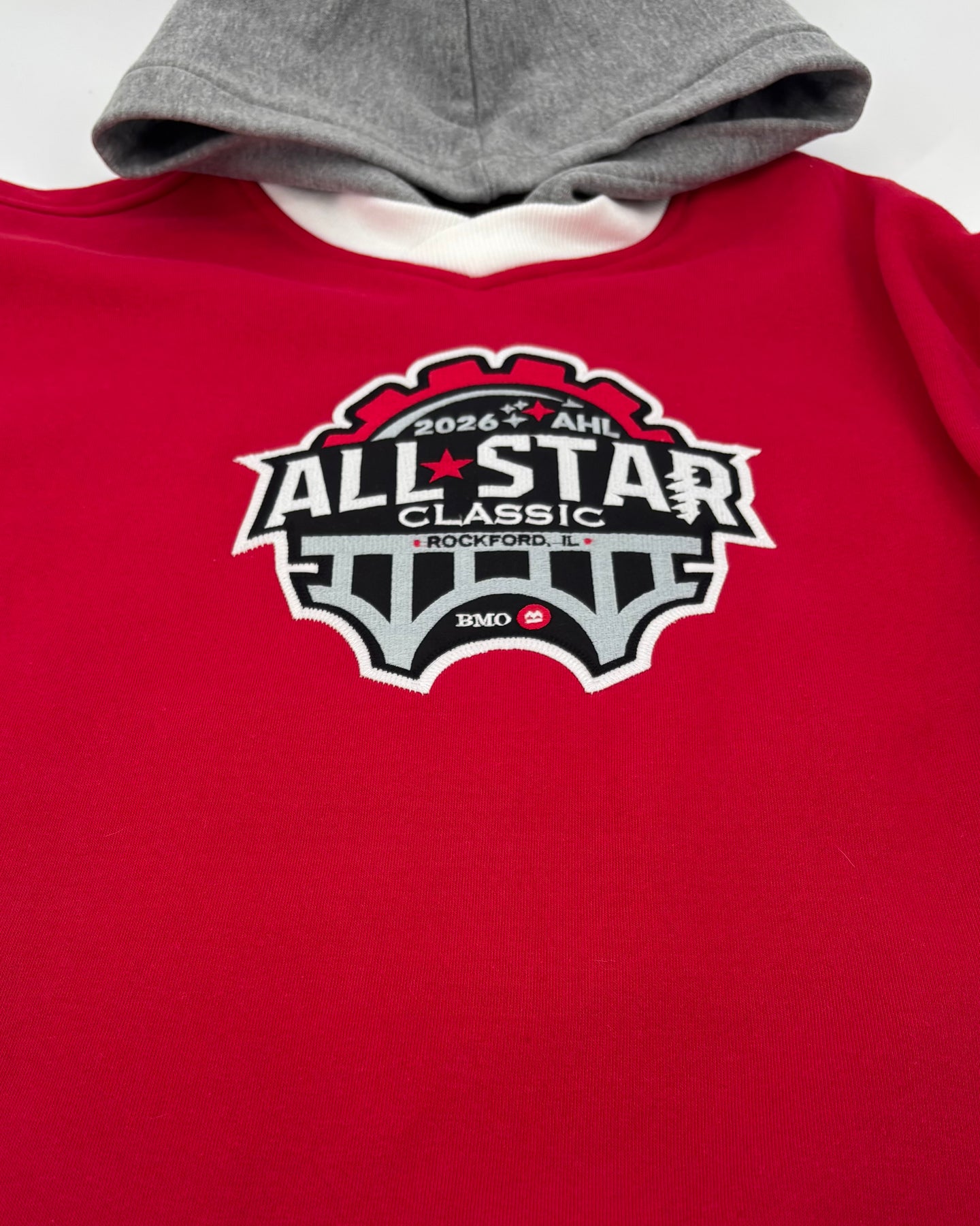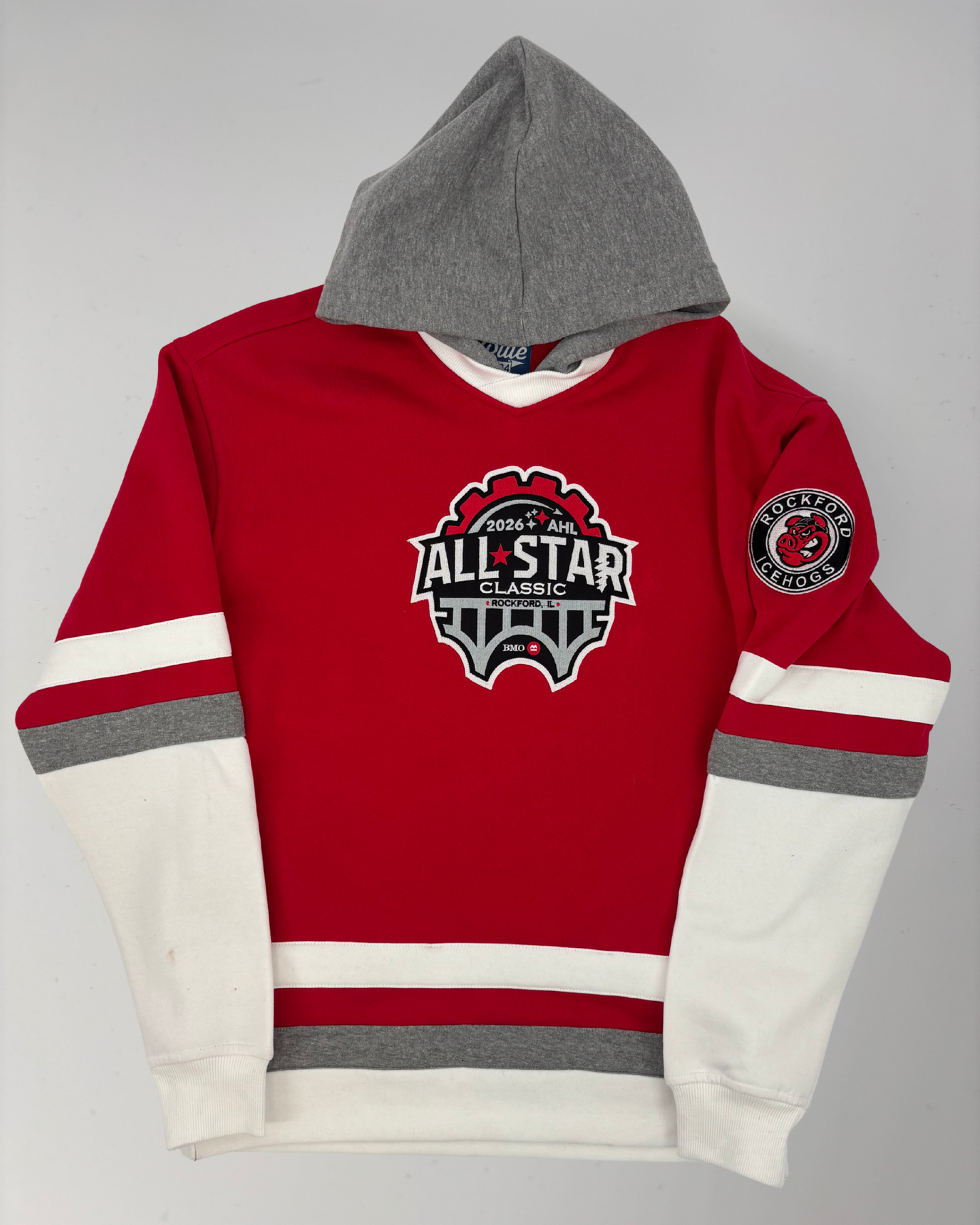 This red Rockford IceHogs All Star Hockey Hoodie features the 2026 All Star logo design across the front on a large patch and an IceHogs medallion logo embroidered on the left sleeve.