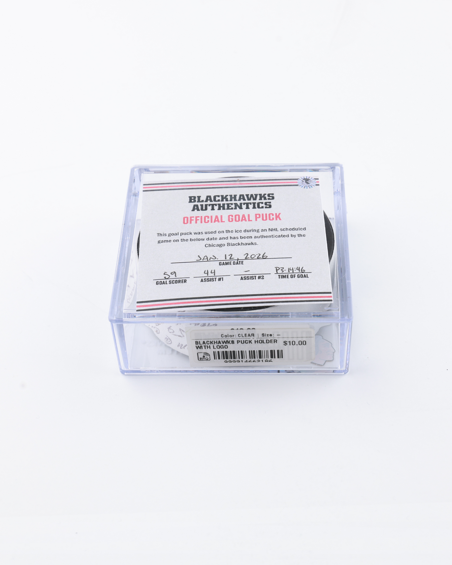 This official game puck was scored by Tyler Bertuzzi against the Edmonton Oilers on January 12, 2026. The goal was scored at 14:46 in the 3rd period, assisted by Wyatt Kaiser. This was Bertuzzi’s 160th career goal and 344th career point. Authenticated with hologram sticker 23923.