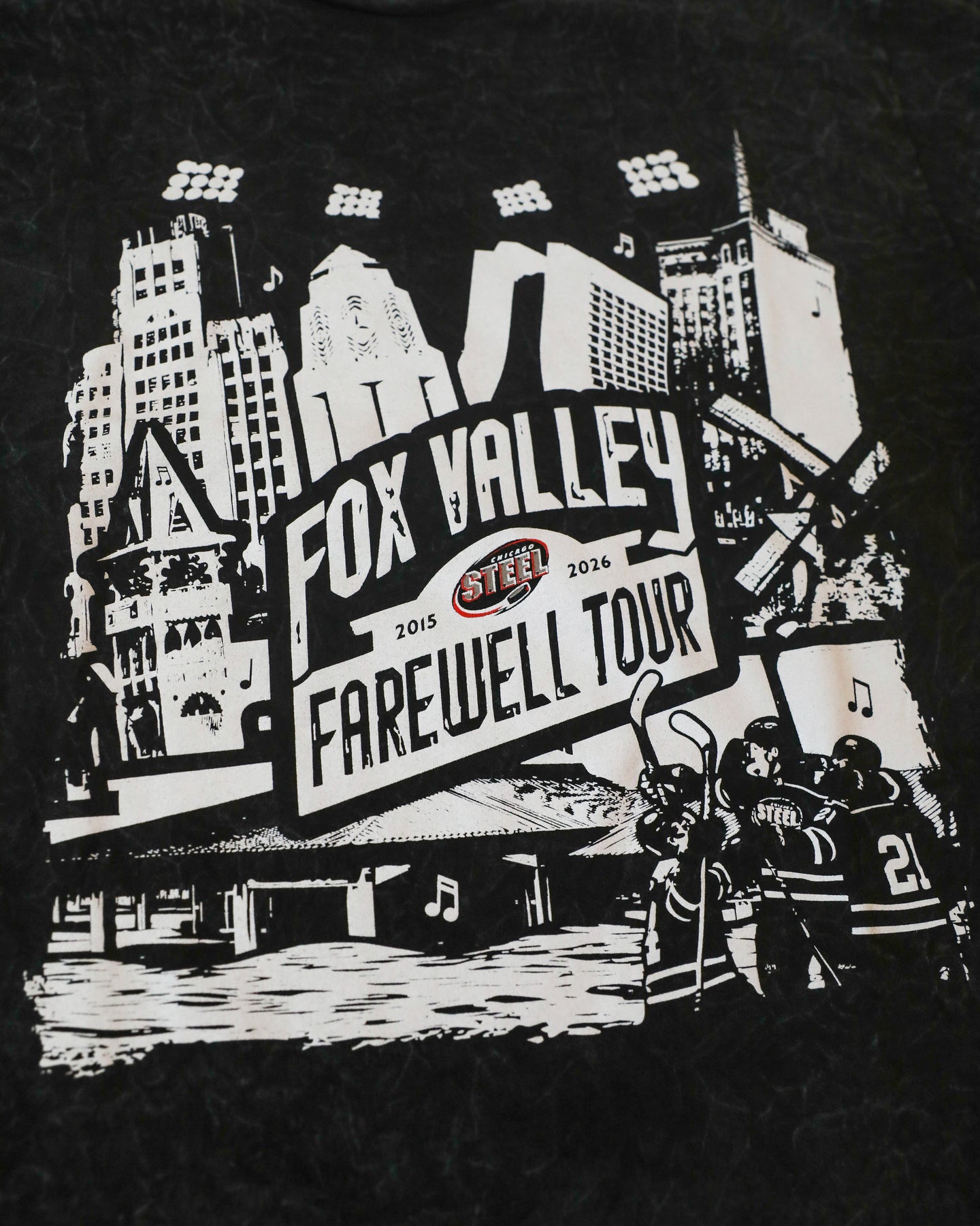 This adult Chicago Steel Farewell Tour Tee features a commemorative tribute design across the front and a list of tour dates on the back.
