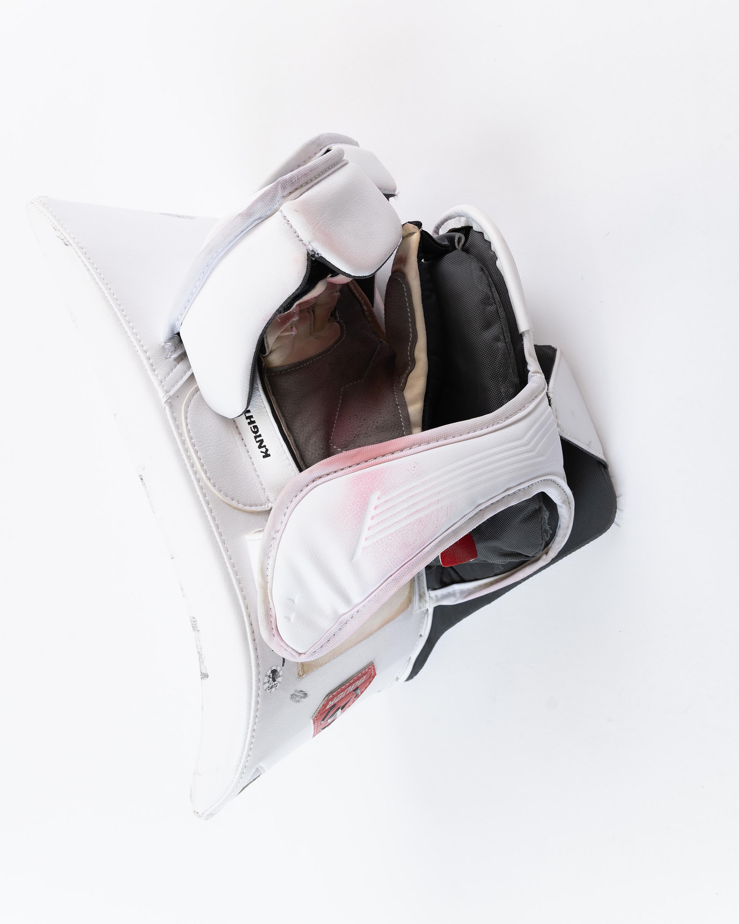 This Bauer goalie blocker was worn by Spencer Knight and has been authenticated with hologram sticker 24871. Does not come with glove, but pairs with glove 24872 (pictured together). This item is not autographed.