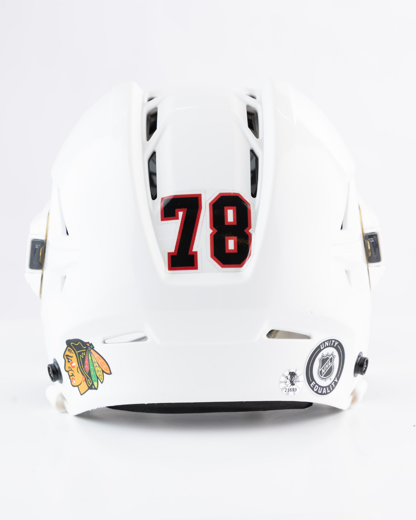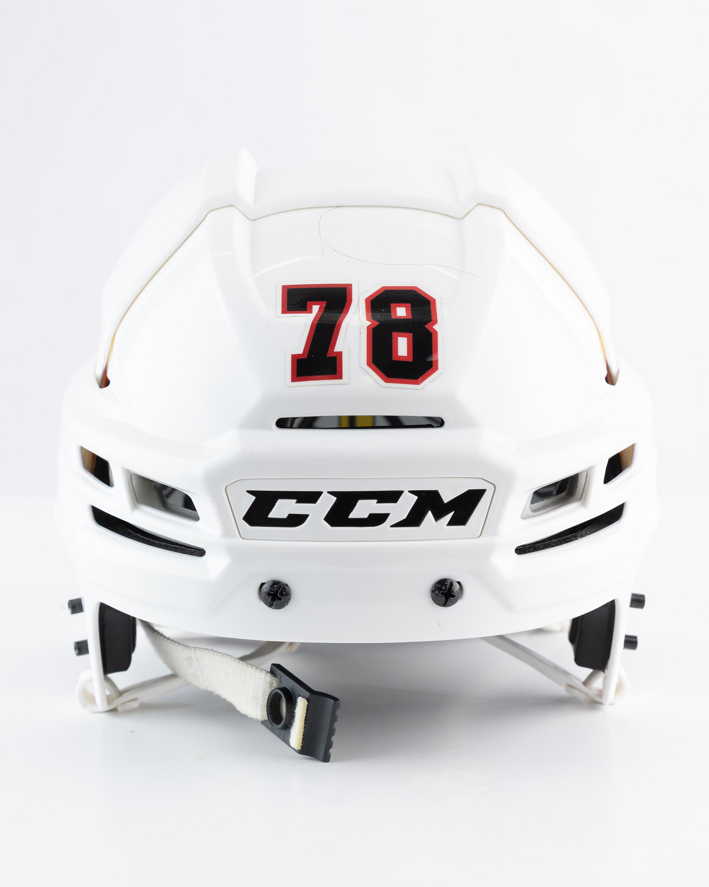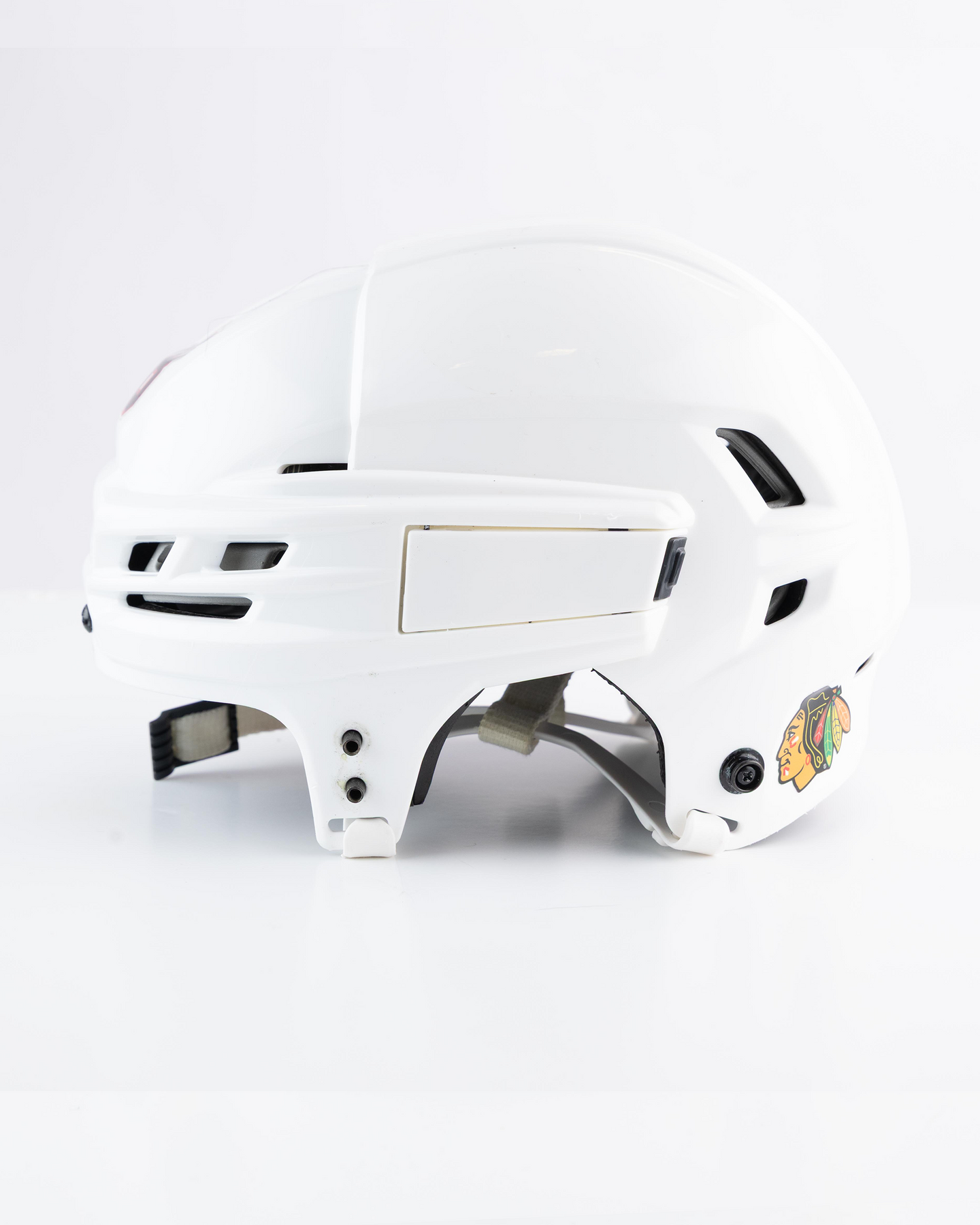 This CCM helmet was worn by TJ Brodie and has been authenticated with hologram sticker 21689. The Blackhawks do not verify that helmets being sold are suitable for personal usage in ice hockey or other sporting activities. All equipment must be used at your own risk. This item is not autographed.