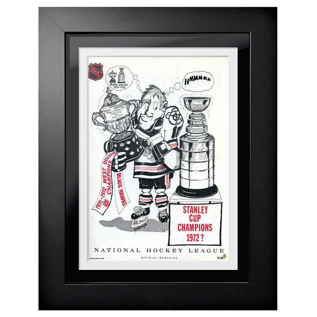 In the early days, long before cell phones and social media, hockey fans would arrive at their arena anxious to buy the latest game program giving them the latest info they needed to follow their favorite team. The advent of digital design and sophisticated photography has dramatically transformed the look and feel of the classic game-night program that captured the attention of fans. As early as the 1920’s, portraits and caricatures captured the scope of what fans would find at the rink. This classic Chicago Stadium Review program from 1972 features unique caricature of legend Dennis Hull.