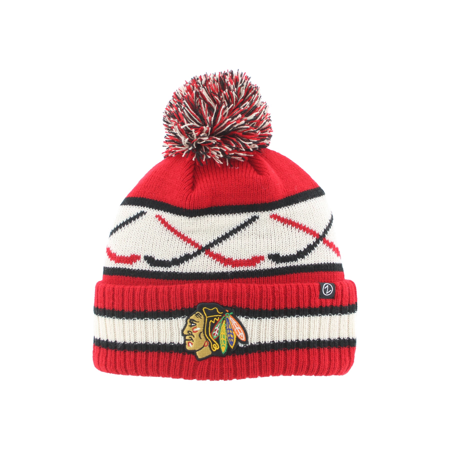Show your Blackhawks pride with this Zephyr Cross Check knit hat, featuring the iconic hockey sticks design woven throughout the cream, red, and black colorway—complete with a matching pom for that championship look.