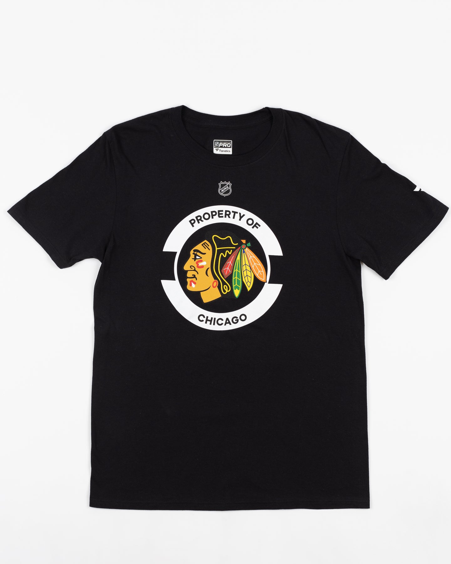 black Fanatics short sleeve tee with Chicago Blackhawks primary logo and Property of Chicago design - front lay flat