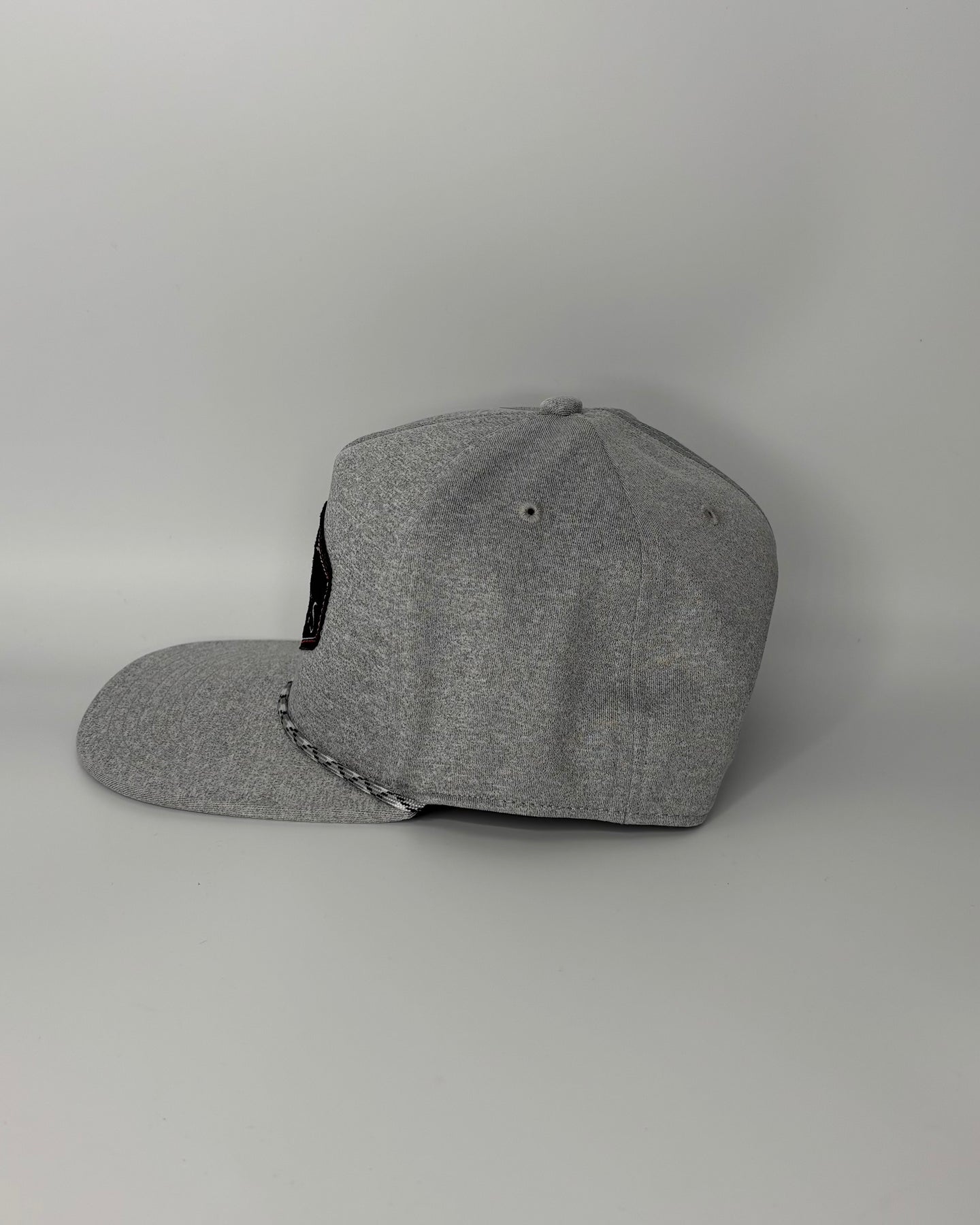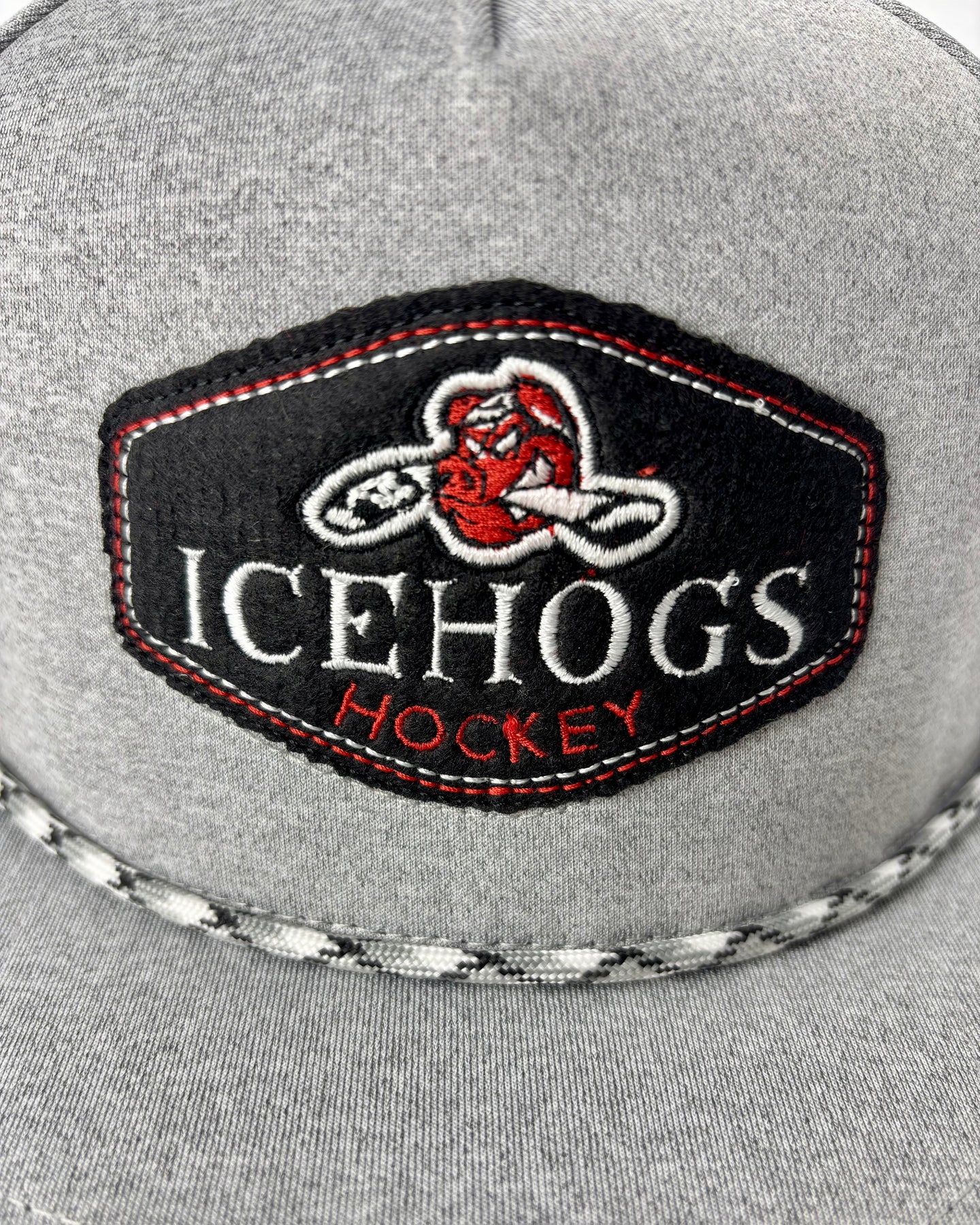 This Rockford IceHogs Legacy Caddy Adjustable Hat features an embroidered felt patch on the front of a heather grey rope hat with a logo on the side.