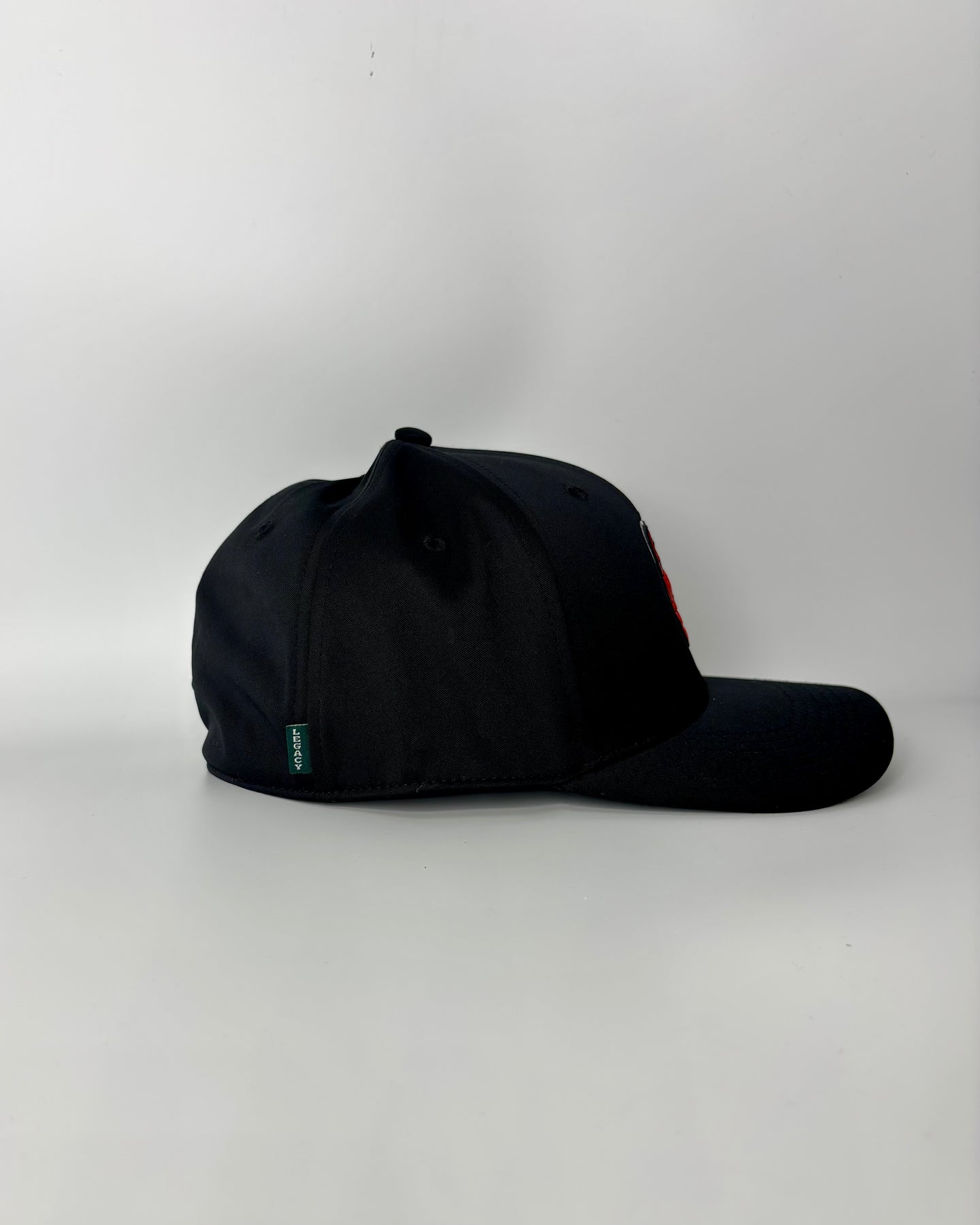 This Rockford IceHogs Legacy Cool Fit Stretch Hat features raised embroidery on the front of a black hat and a logo on the back.