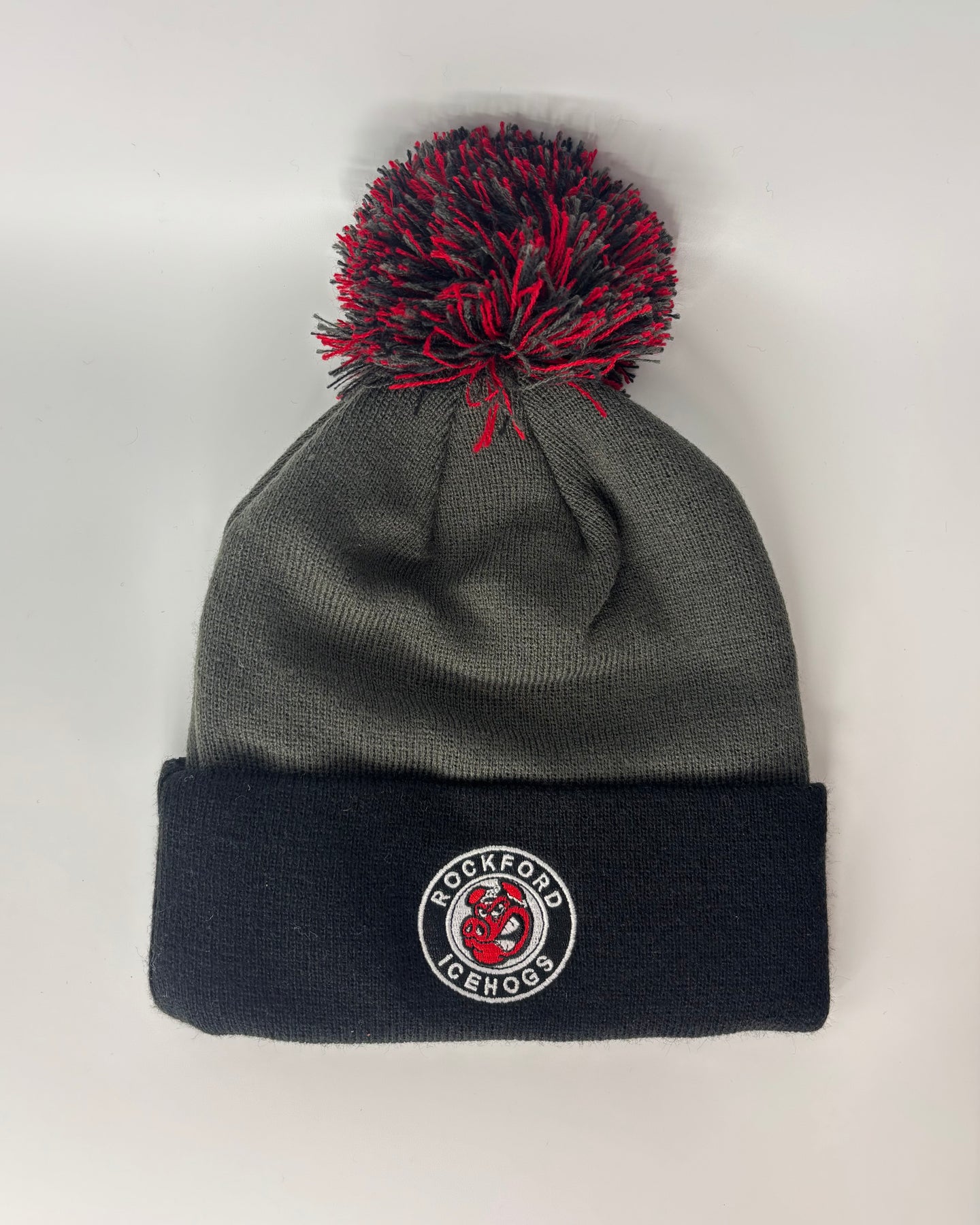 This Rockford IceHogs Zephyr Knit Hat is dark grey and features a medallion logo embroidered on the black cuff and a multi-colored pom.
