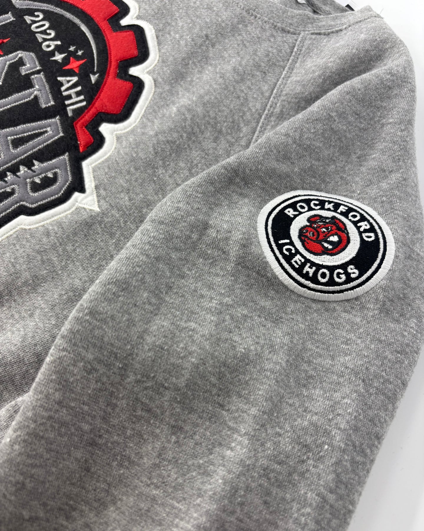 This Rockford IceHogs Grey All Star Classic Crewneck features the 2026 All Star logo design across the front on a large patch and an IceHogs medallion logo embroidered on the left sleeve.