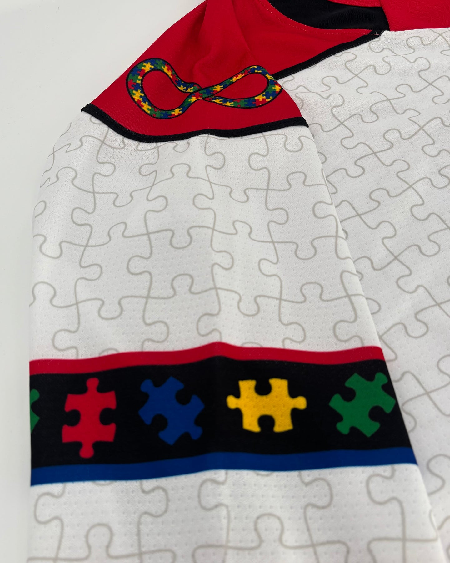 Licensed by the AHL, this CCM Rockford IceHogs Autism Awareness Replica Jersey features the Autism Awareness embroidered medallion across the front with puzzle piece detailing throughout the jersey. The Rockford IceHogs logo adorns the left shoulder.